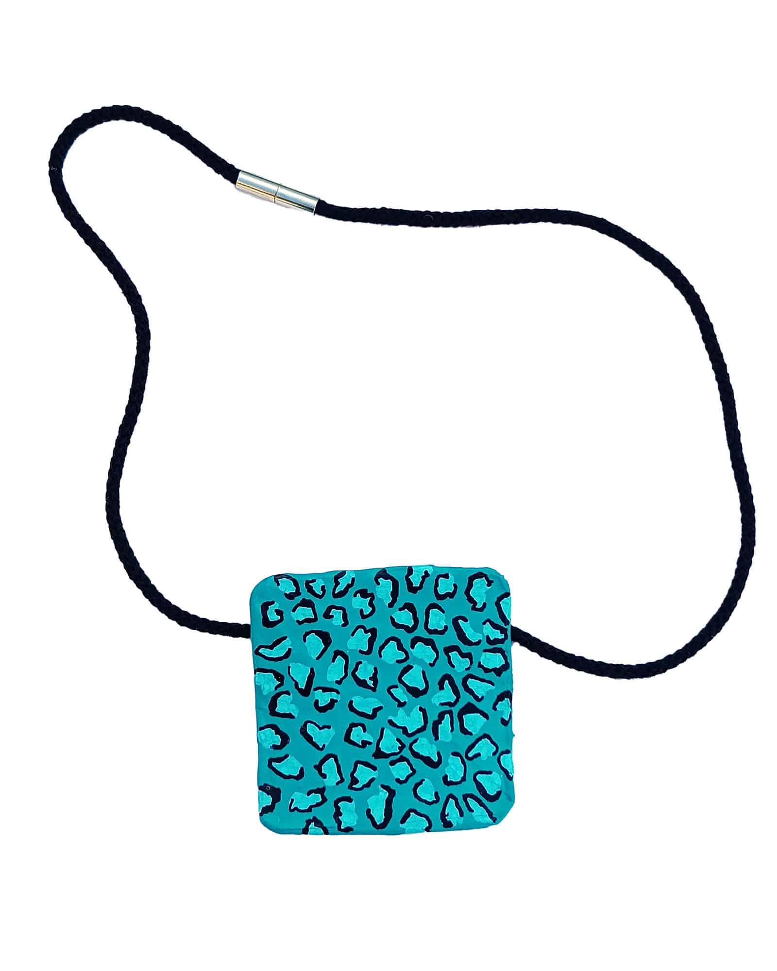 Colgante Indra cuadrado con estampado de leopardo sobre fondo azul turquesa. Añade un toque moderno y elegante a tu look. Fabricados en papel maché con cierre de latón, bañado en plata, cierre con sistema de imán.