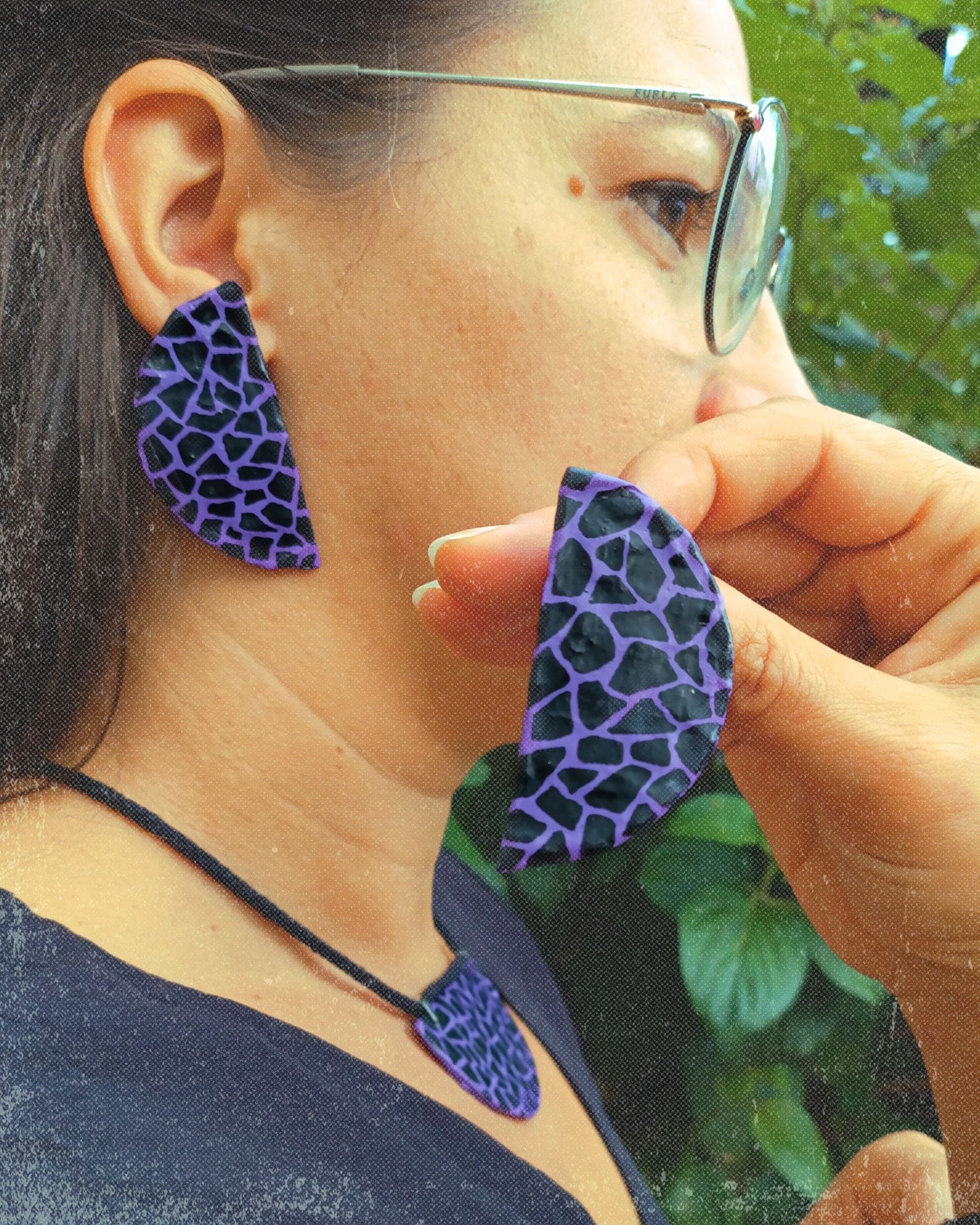Conjunto Lilith, con forma de semicircunferencia con estampado de serpiente negro sobre fondo lavanda. Añade un toque moderno y elegante a tu look. Fabricados en papel maché con cierre y poste de latón , bañado en plata. El cierre del colgante es de imán.