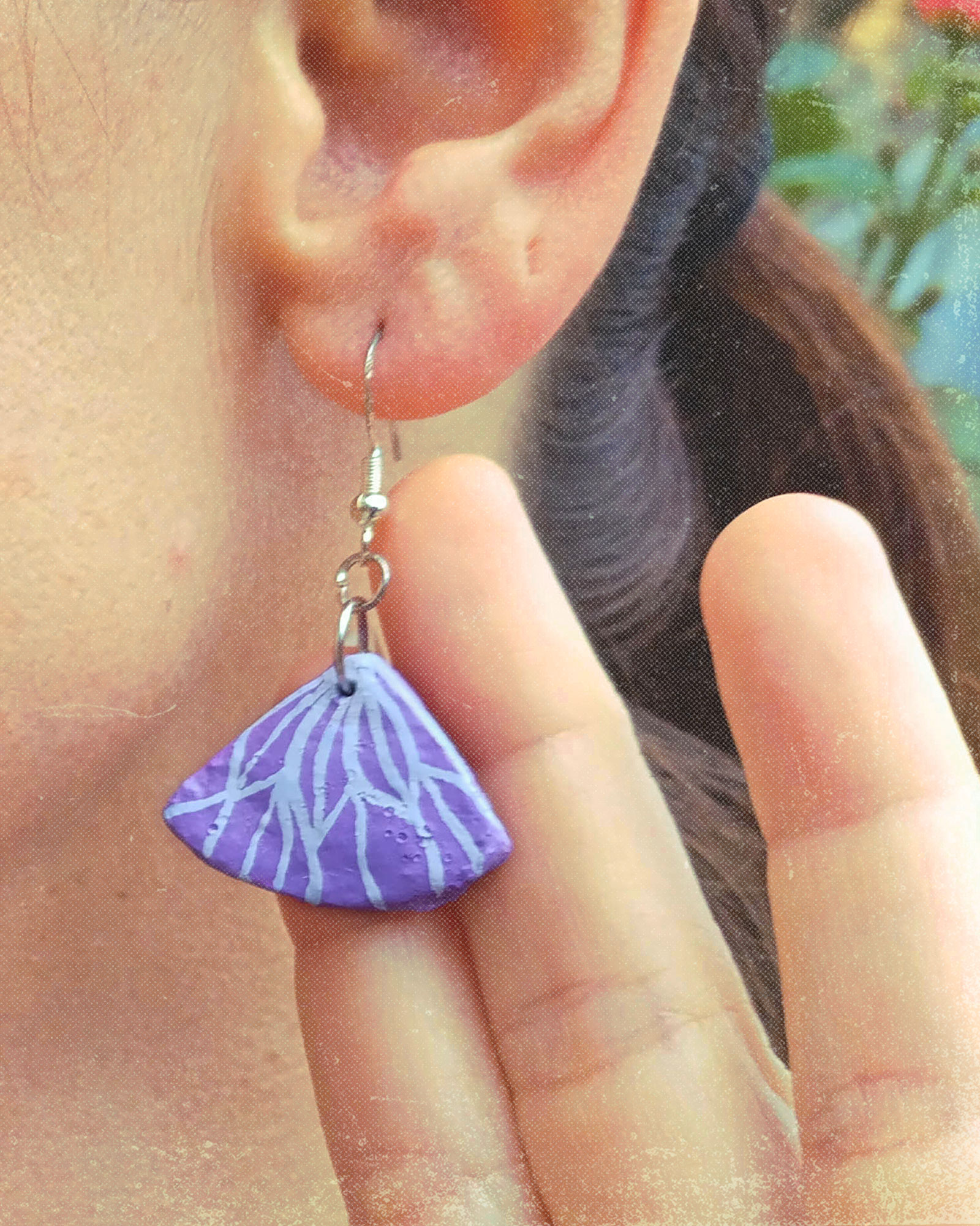 Pendientes Iris en papel maché, ligeros y artesanales. Diseño lila en forma de cuarto de circunferencia con delicados motivos florales. Fabricados en papel maché con cierre plástico y poste de acero, bañado en plata, hipoalergénicos.