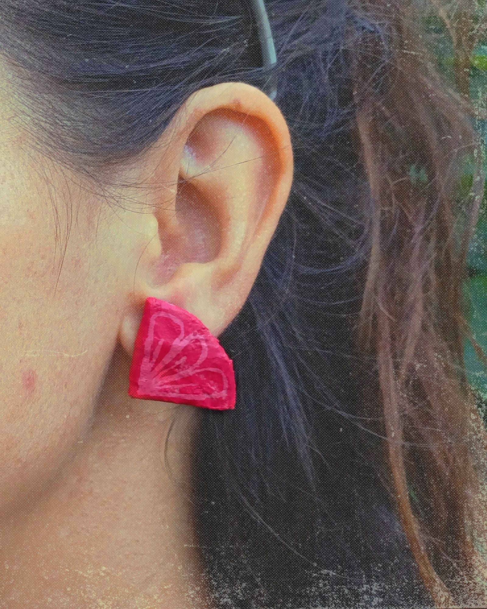 Aurora, pendientes rojos con delicados motivos florales y forma semicircular. Un toque alegre y femenino para tu look diario. Fabricados en papel maché con cierre y poste de acero, bañados en plata, hipoalergénicos