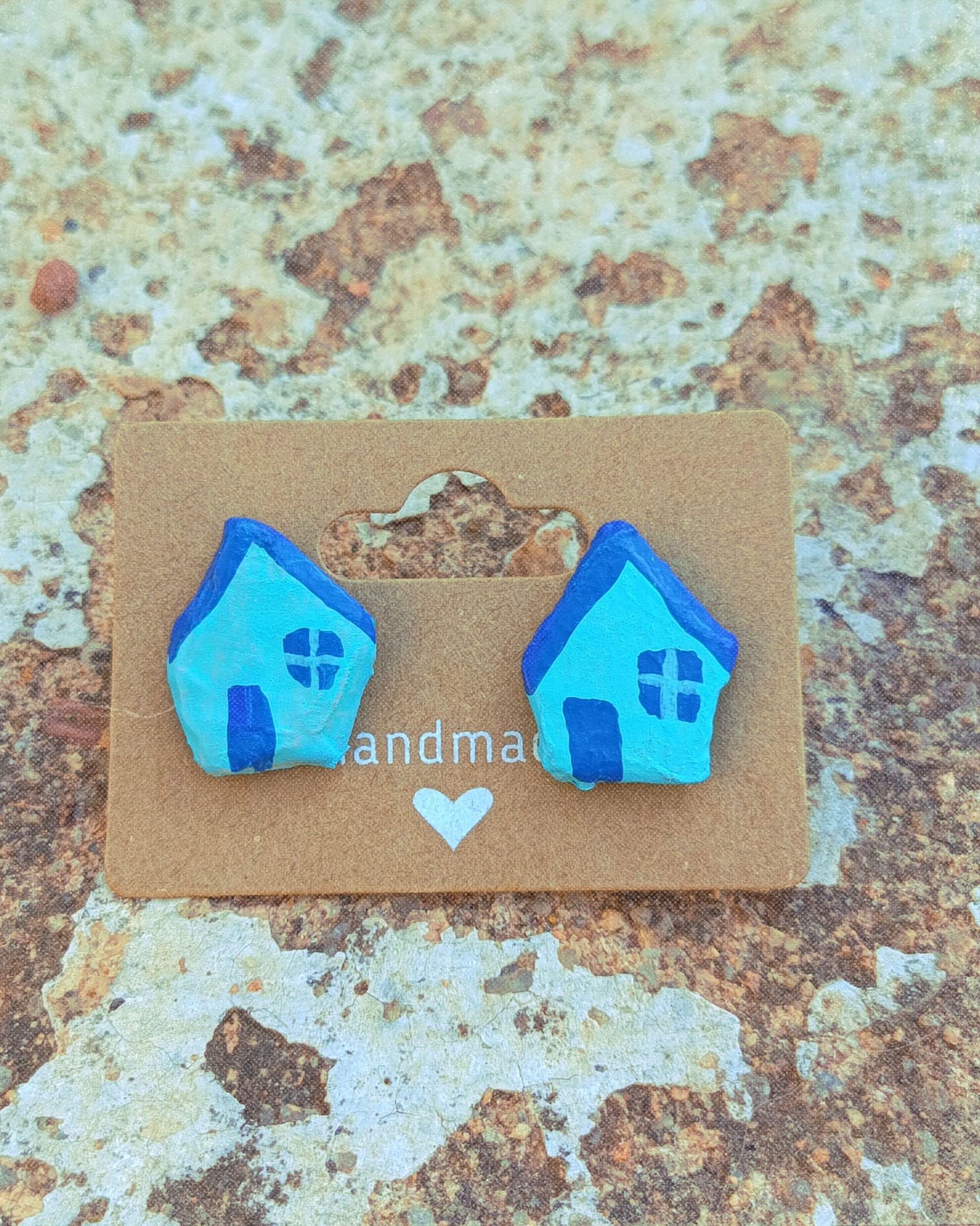 Pendientes infantiles con diseño de casita azul, alegres y divertidos. Ligeros y perfectos para regalar o añadir un toque encantador a cualquier look infantil. Fabricados en papel maché con cierre y poste de acero, bañados en plata, hipoalergénicos.
