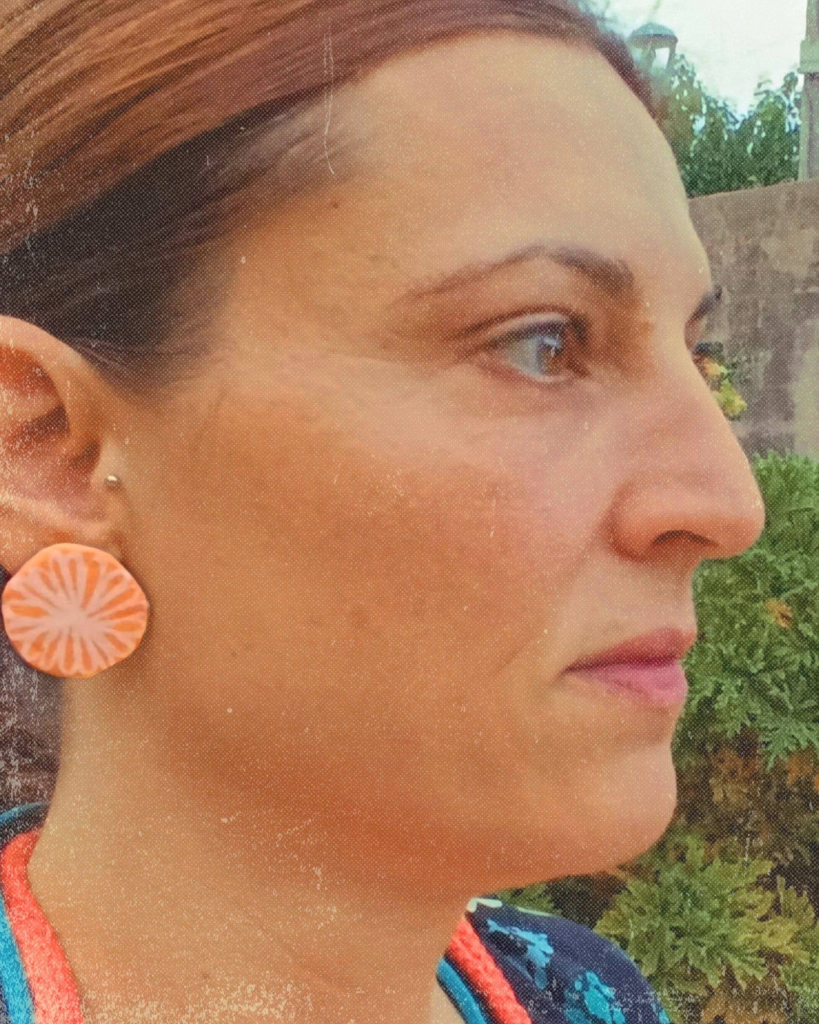 Pendientes Dalia en tono naranja con diseño circular y delicado motivo floral. Artesanales, ligeros y llenos de estilo boho alegre y natural. Fabricados en papel maché con cierre y poste de acero, bañado en plata, hipoalergénicos.