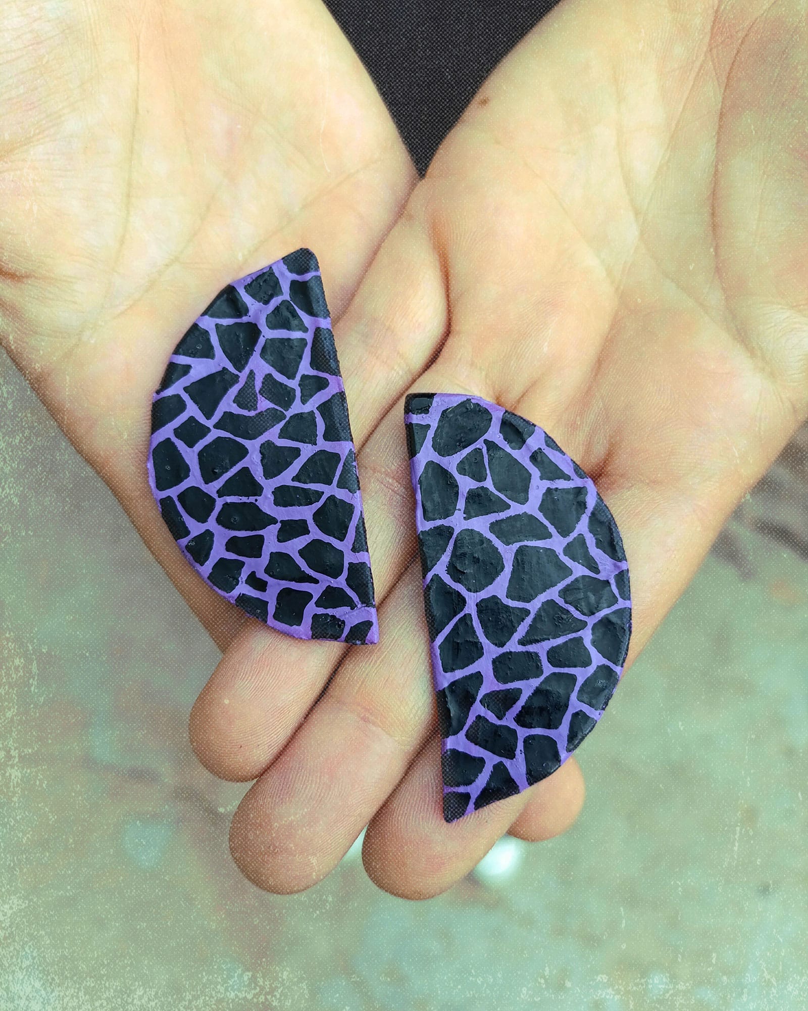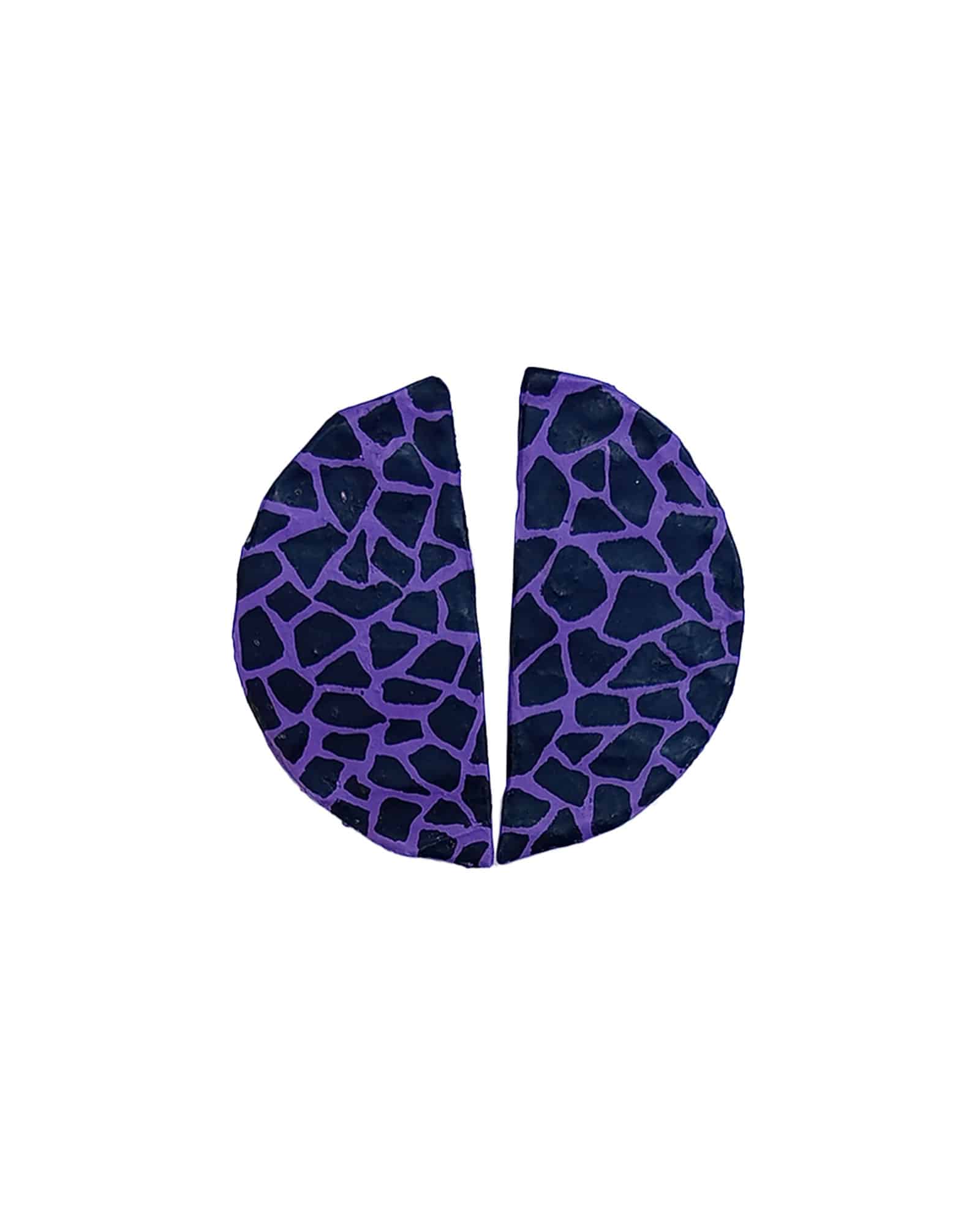 Pendientes Lilith, con forma de semicircunferencia con estampado de serpiente negro sobre fondo lavanda. Una pieza que aporta carácter y delicadeza al mismo tiempo. Añade un toque moderno y elegante a tu look. Fabricados en papel maché con cierre y poste de latón , bañado en plata.