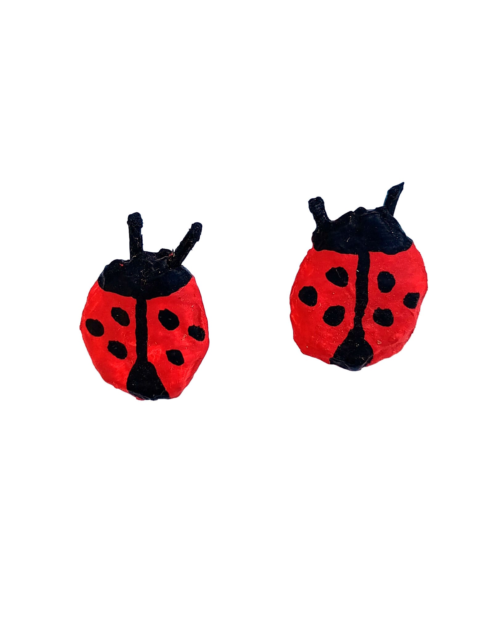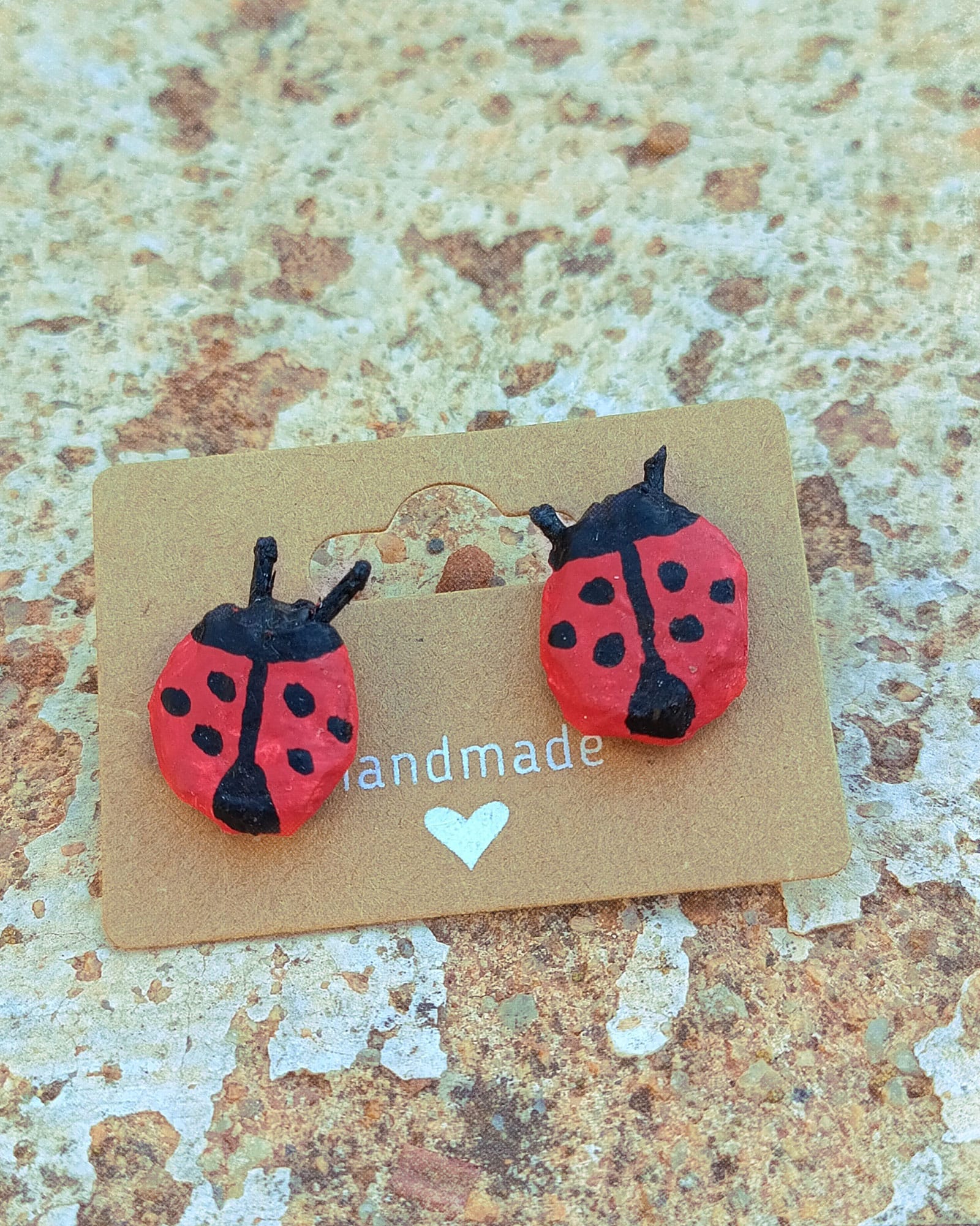 Pendientes infantiles con diseño de mariquita, coloridos y divertidos. Ligeros y perfectos para regalar o añadir un toque alegre a cualquier look infantil. Fabricados en papel maché con cierre y poste de acero, bañados en plata, hipoalergénicos.