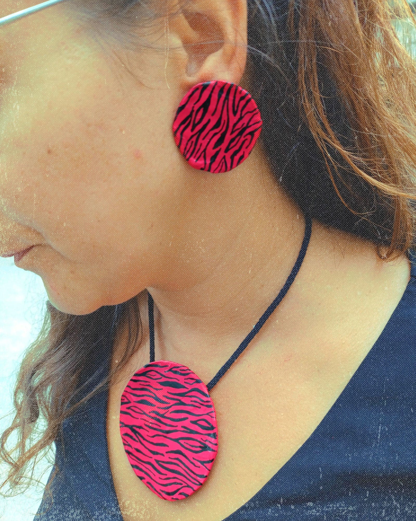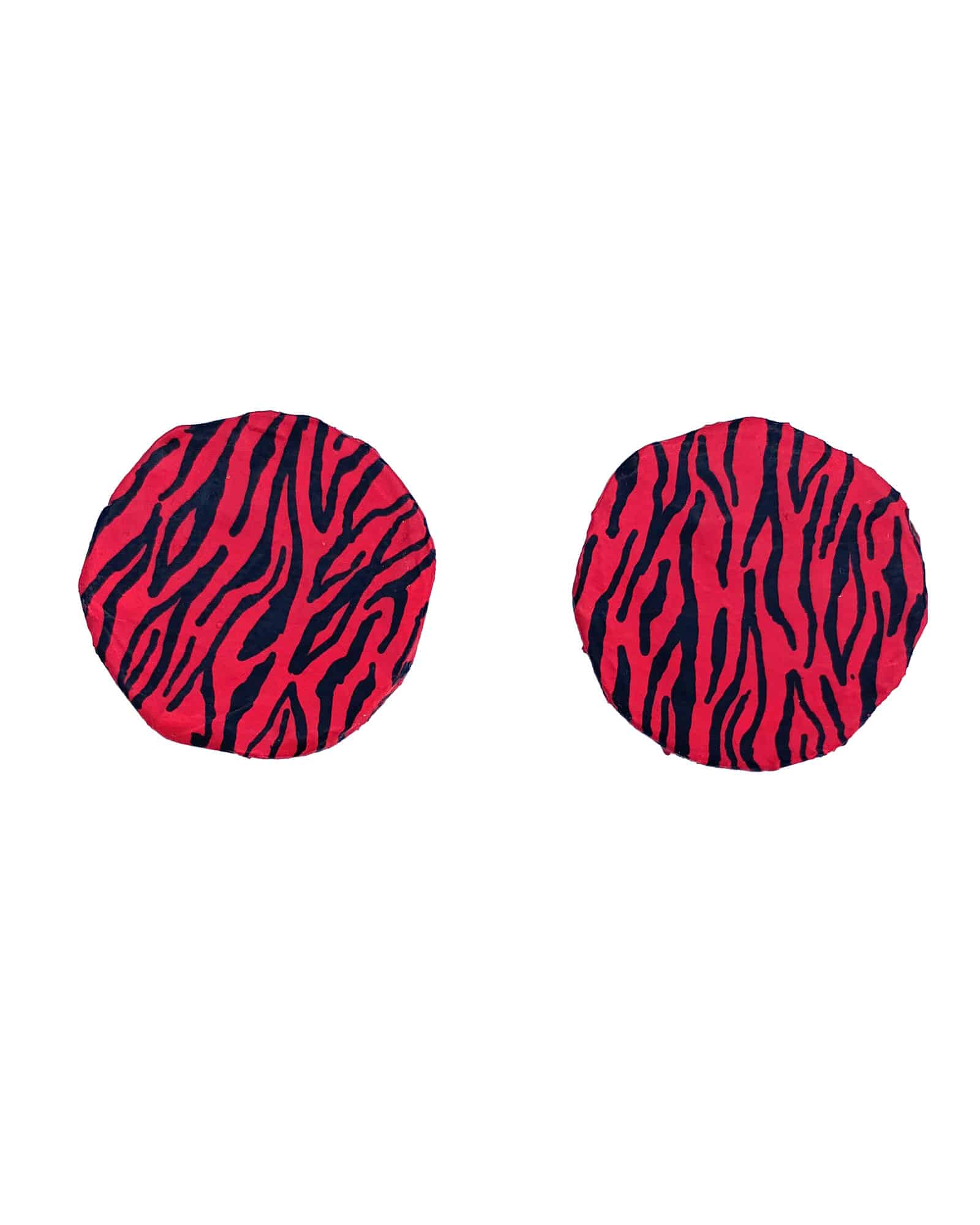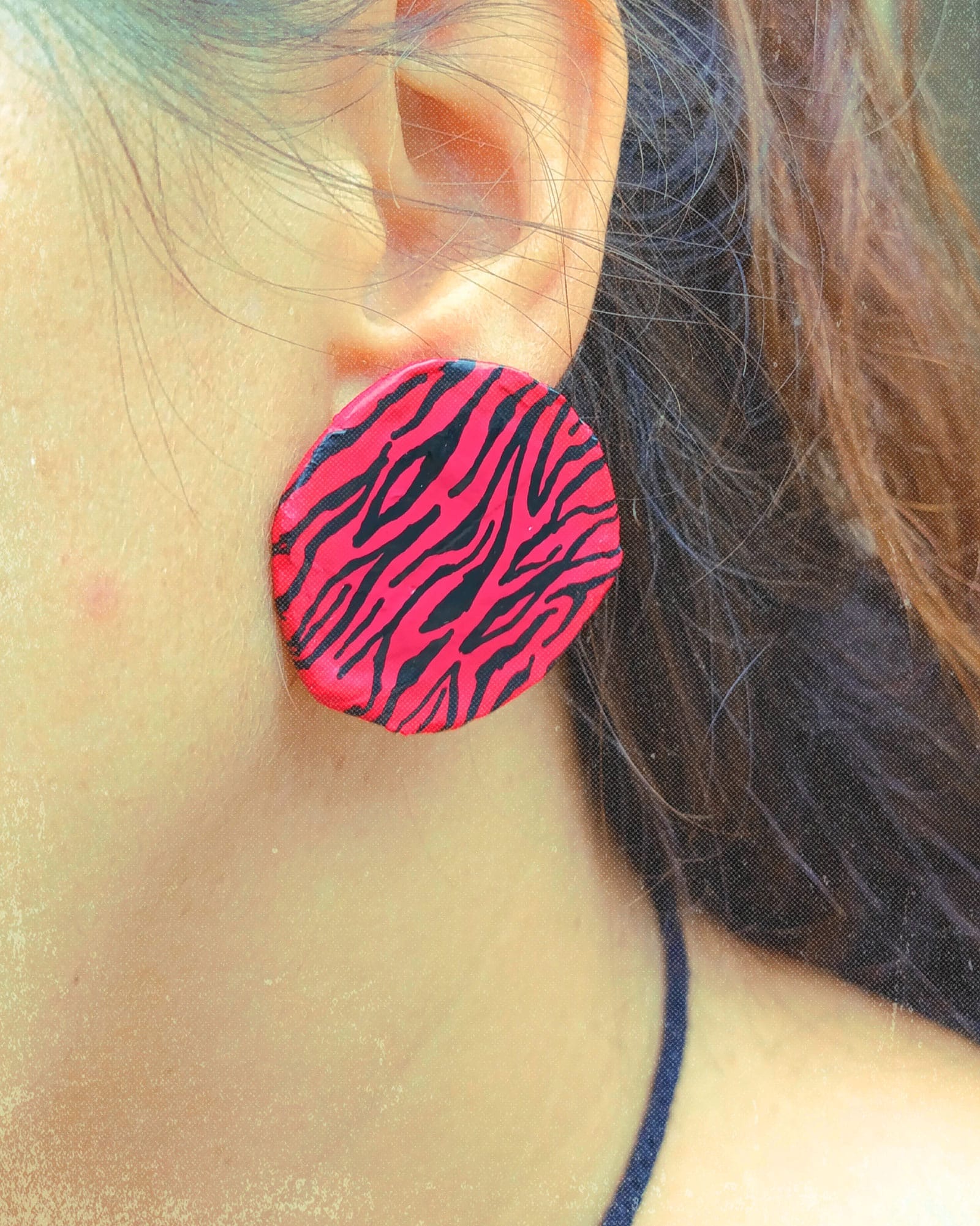 Pendientes Sahara redondos con estampado de cebra sobre fondo rojo. Añade un toque moderno y elegante a tu look. Fabricados en papel maché con cierre y poste de latón , bañado en plata.